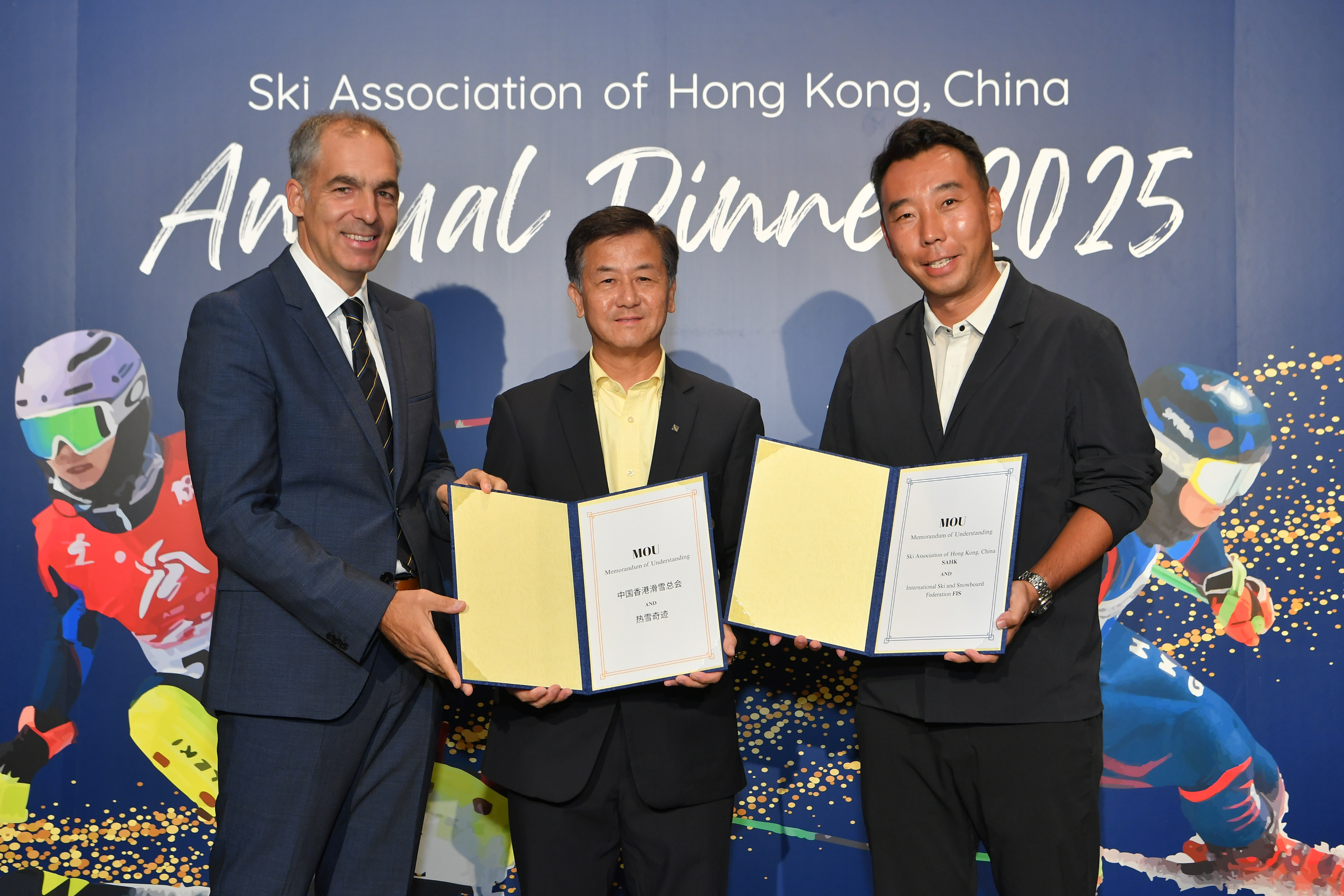 On 22nd August 2025, SAHK signed a historic MoU with both the International Ski & Snowboard Federation, and BONSKI at our 2025 Annual Dinner and OWG Fundraising DinnerAugust 22nd 2025. An MoU signed with Mr. Dimitrije Lazarovski - Director for Development Programmes for the International Ski and Snowboard Federation, and one signed with Vice President of BONSKI Mr Yi Li represents the collective hopes to advance the development of winter sports in Asia, China and with the rest of the world.